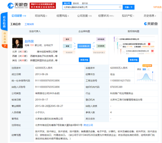 天眼查数据显示,紫光展锐的运营主体为北京紫光展锐科技有限公司,成立于2013年8月,注册资本42亿元人民币,法定代表人为公司董事长赵伟国。