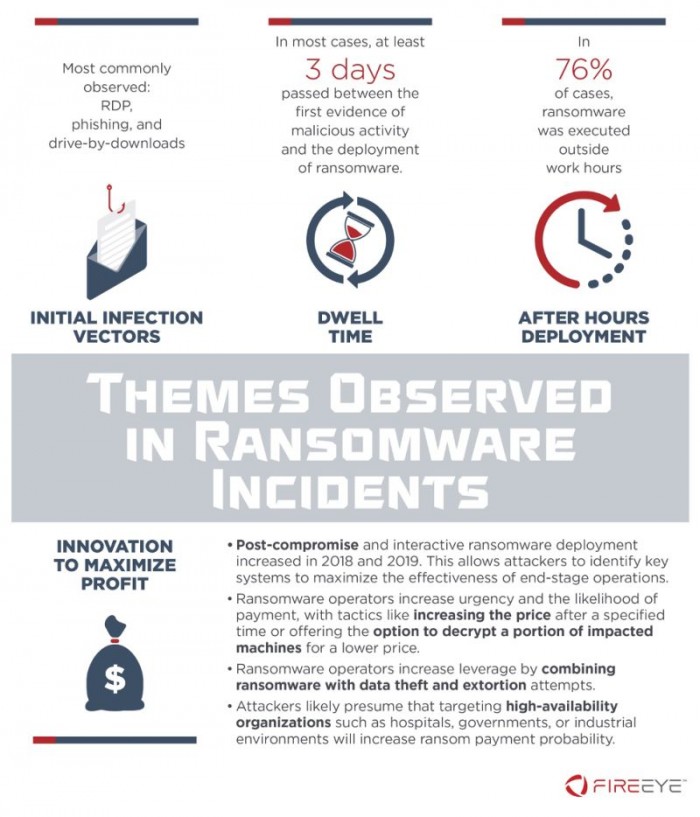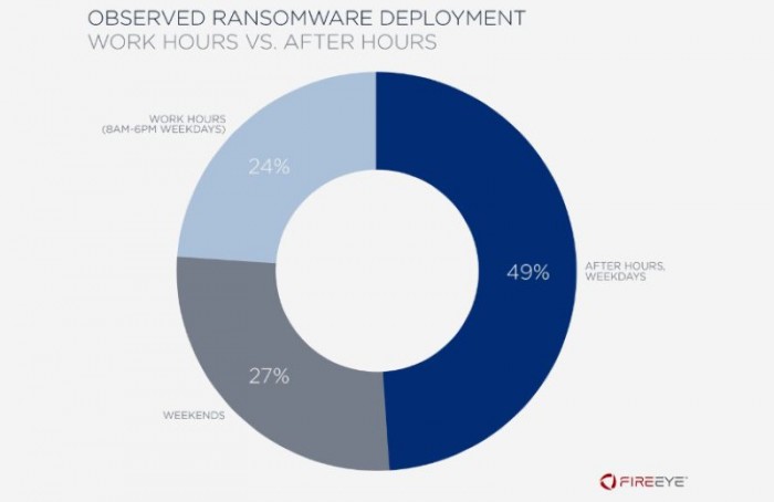 针对企业部门的绝大多数勒索软件攻击都是在非工作时间段内发生的,主要集中在晚上和周末时间。根据美国网络安全公司FireEye今天发布的报告,企业部门感染勒索软件事件中76%发生在非工作时间段,包括49%发生在工作日的夜间,27%发生在周末。