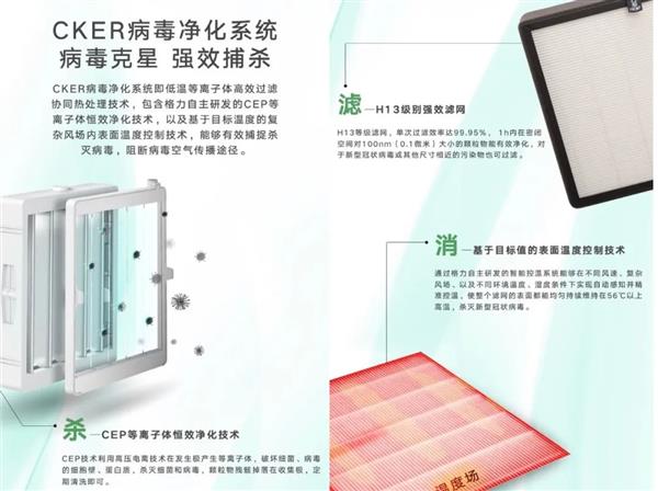 官方介绍,基于当前医学新冠病毒消杀原理,CKER病毒净化系统运用格力自主研发的CEP等离子体恒效净化技术、H13级别强效过滤网、基于目标值的表面温度控制技术对病毒进行杀、滤、消三重净化。