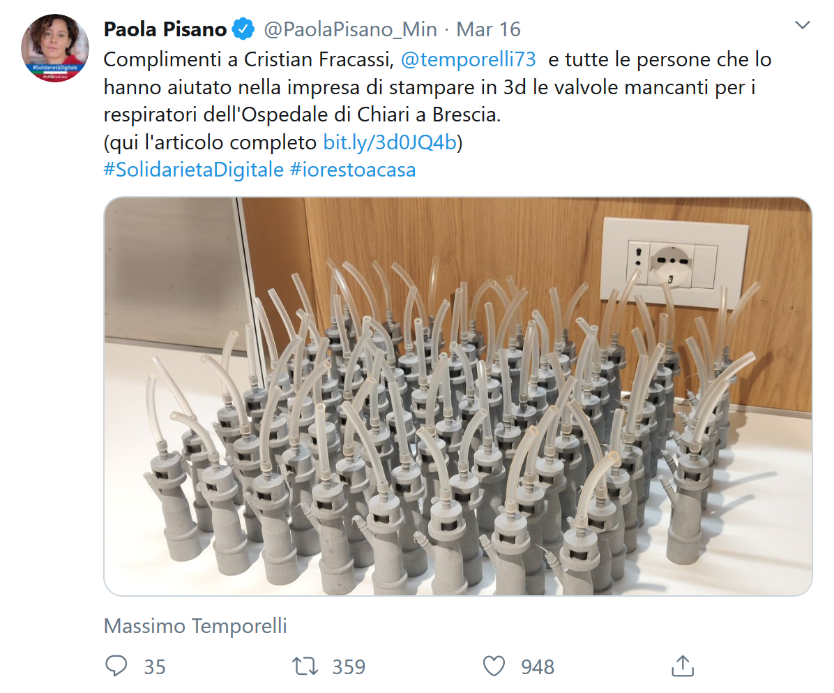 意大利一家医院在治疗新冠肺炎病人时已经用完了这种瓣膜,他们急需这一医疗材料。然而据Metro报道,这家医院长期合作的供应商表示,他们无法及时制造出治疗这些产品。对此,意大利初创公司Isinnova的Cristian Fracassihe和Alessandro Ramaioli决定利用3D打印机来解决这个问题。