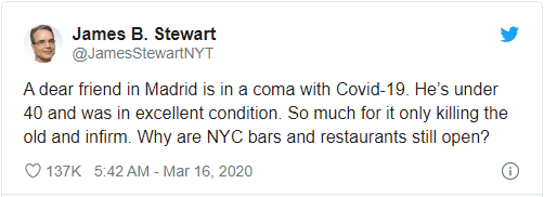 尽管新型冠状病毒引发的 COVID-19 疾病对年老者的危害更大,但很多人还是不太理解为何一些身体健康的年轻人也会中招。近日,《纽约时报》的 James B. Stewart 在 Twitter 上表示:“目前所知的是本次疫情最影响年老体弱的人,但我有一位在马里兰州的朋友感染了 COVID-19,他不到 40 岁且健康良好 —— 为何纽约市的酒吧和餐馆都还在开门营业?”