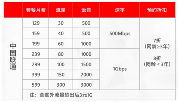不速率方面,中国联通共有7个套餐,其中129元/159元/199元三个档位速率为500Mbps,239元/299元/399元/599元为1Gbps。