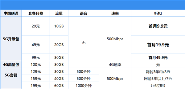 除了中国联通5G升级包是500Mbps速率,其实三大运营商的低价5G套餐都是在500Mnps。