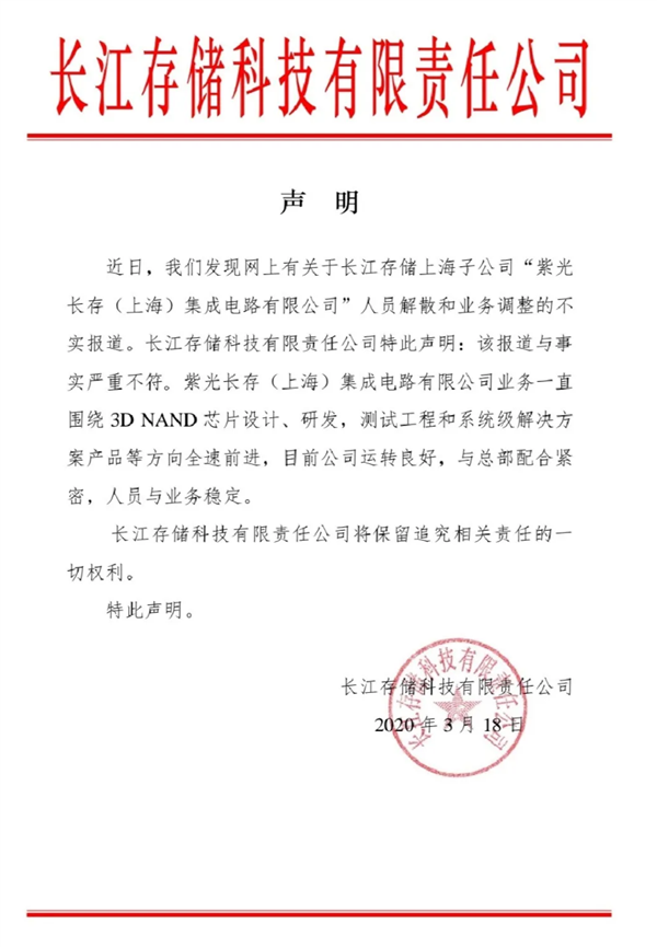 不过长江存储方面给出的公告又不太一样了,官方发表的公告措辞严厉,表示“该报道与事实严重不符。紫光长存(上海)集成电路有限公司业务一直围绕3D NAND芯片设计、研发,测试工程和系统级解决方案产品等方向全速前进,目前公司运转良好,与总部配合紧密,人员与业务稳定。”