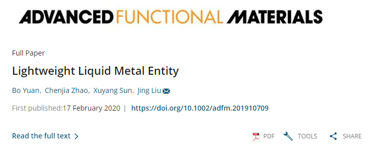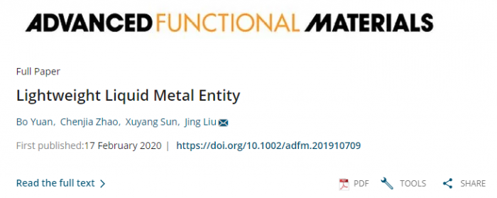 据悉,该团队名为 Lightweight Liquid Metal Entity(轻质液态金属)的论文已于 2020 年 2 月 17 日登上《先进功能材料》(Advanced Functional Materials)期刊。