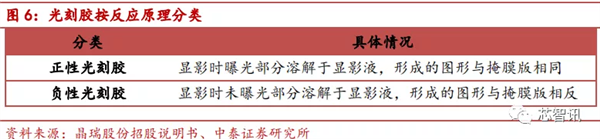光刻胶可依据不同的产品标准进行分类。按照化学反应和显影的原理,光刻胶可分为正性光刻胶和负性光刻胶。如果显影时未曝光部分溶解于显影液,形成的图形与掩膜版相反,称为负性光刻胶;如果显影时曝光部分溶解于显影液,形成的图形与掩膜版相同,称为正性光刻胶。