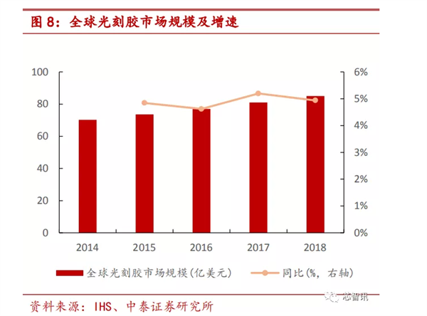 在半导体、LCD、PCB 等行业需求持续扩大的拉动下,光刻胶市场将持续扩大。2018 年全球光刻胶市场规模为 85 亿美元,2014-2018 年复合增速约 5%。据 IHS数据,未来光刻胶复合增速有望维持 5%。