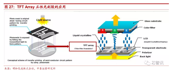 除了RGB光刻胶和黑色光刻胶之外,TFT Array 正性光刻胶也非常重要,其主要用于 TFT-LCD 制程中的 Array 段,主导 TFT 设计的图形转移,其解析度、热稳定性、剥膜性、抗蚀刻能力都优于负性光刻胶。