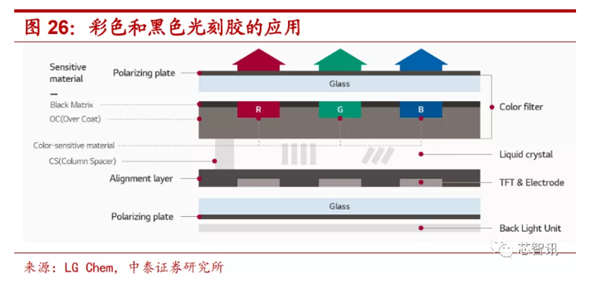从成本方面来看,彩色滤光片占面板总成本的 14%-16%,而彩色和黑色光刻胶占彩色滤光片成本的 27%左右,其中黑色光刻胶占比 6%-8%,光刻胶质量的好坏将直接影响到滤光片的显色性能。