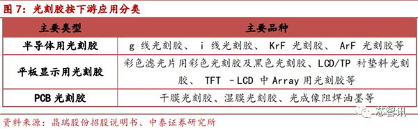 光刻胶又称光致抗蚀剂,是光刻工艺的关键化学品,主要利用光化学反应将所需要的微细图形从掩模版转移到待加工基片上,被广泛应用于光电信息产业的微细图形线路的加工制作,下游主要用于集成电路、面板和分立器件的微细加工,同时在 LED、光伏、磁头及精密传感器等制作过程中也有广泛应用,是微细加工技术的关键性材料。