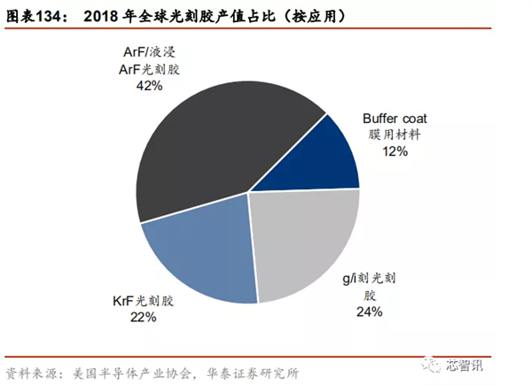 根据SEMI的数据,2018年全球半导体用光刻胶市场,G线&I线、KrF、ArF&液浸ArF三分天下,占比分别达到了24%、22%和42%。其中,ArF/液浸ArF 光刻胶主要对应目前的先进 IC 制程,随着双/多重曝光技术的使用,光刻胶的使用次数增加,ArF 光刻胶的市场需求将加速扩大。