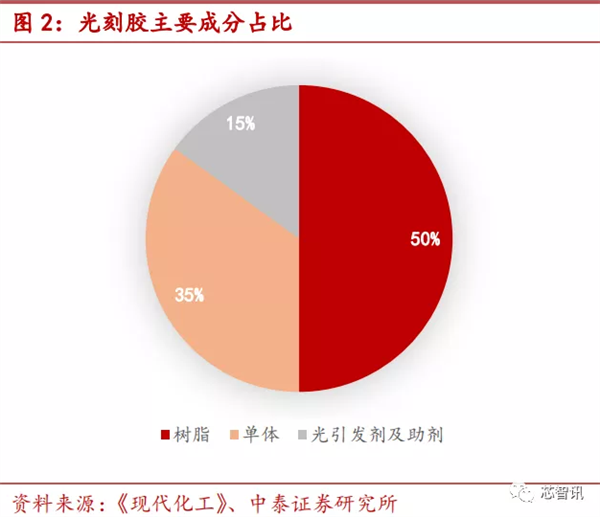 光刻胶的主要成分为树脂、单体、光引发剂及添加助剂四类。其中,树脂约占 50%,单体约占35%,光引发剂及添加助剂约占15%。