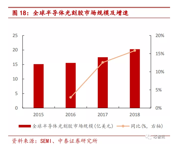 伴随着全球半导体行业的快速发展,全球半导体光刻胶市场持续增长。2018 年全球半导体光刻胶市场规模 20.29 亿美元,同比增长 15.83%。其中,中国半导体光刻胶规模占全球比重最大,达到 32%。