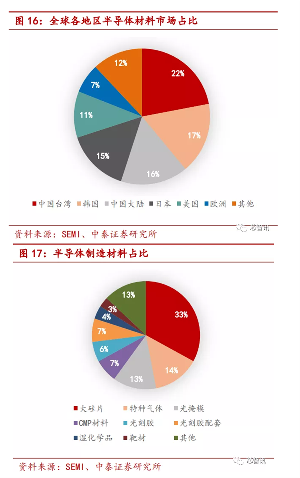 分地区来看,目前大陆半导体材料市场规模 83 亿美元,全球占比 16%,仅次于中国台湾和韩国,为全球第三大半导体材料区域。