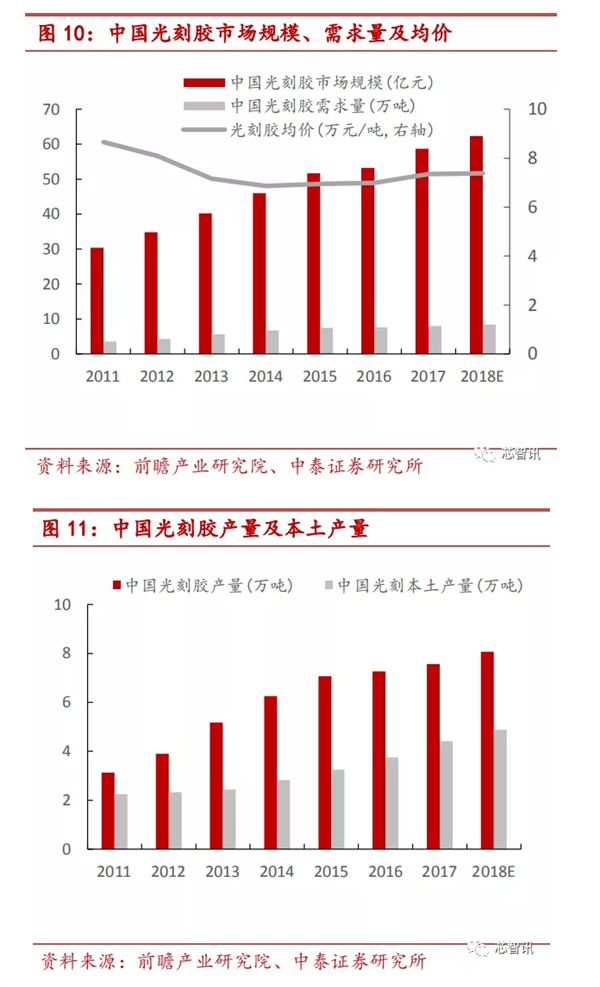 从产量来看,2017 年我国光刻胶产量达到 7.56 万吨,2011-2017 年复合增速 15.83%;本土光刻胶产量达到 4.41 万吨,2011-2017 年复合增速 11.87%。
