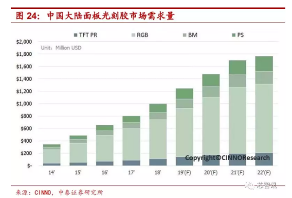 据 CINNO Research 预估,2022 年大陆 TFT Array正性光刻胶(包含 LTPS 基板)需求量将达到 1.8 万吨,彩色光刻胶需求量为 1.9 万吨,黑色光刻胶需求量为 4100 吨,光刻胶总产值预计高达 15.6 亿美金。