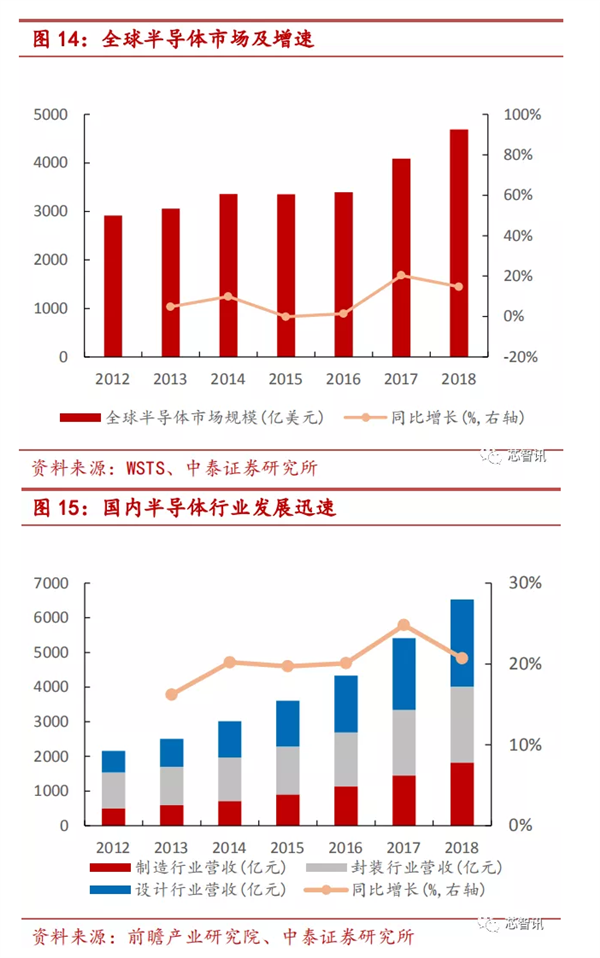 全球半导体市场规模近年来增速平稳,2012-2018 年复合增速 8.23%。其中,中国大陆集成电路销售规模从 2158 亿元迅速增长到 2018 年的 6531 亿元,复合增速为20.27%,远超全球其他地区,全球半导体产业加速向大陆转移。