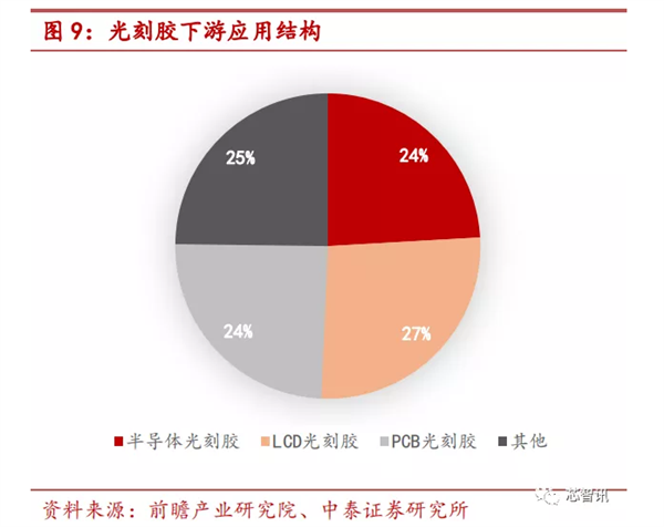 按照下游应用领域来看,根据前瞻产业研究院的数据显示,目前半导体光刻胶占比 24.1%,LCD 光刻胶占比 26.6%, PCB 光刻胶占比 24.5%,其他类光刻胶占比 24.8%。