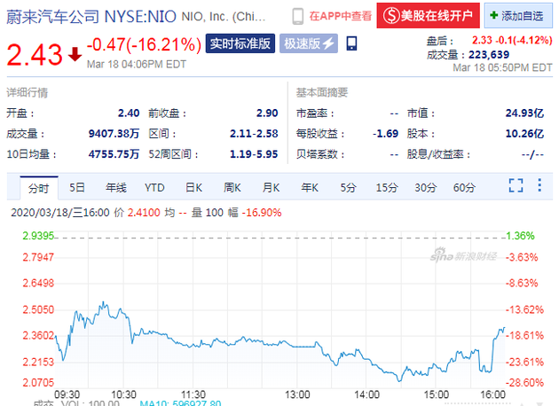 周三收盘,蔚来汽车(NYSE:NIO)股价大跌16.21%,报2.43美元。此前,蔚来汽车发布了截至12月31日的2019年第四季度及全年财报。第四季度,蔚来汽车总营收为人民币28.483亿元(约合4.091亿美元),环比增长55.1%,同比下降17.1%。