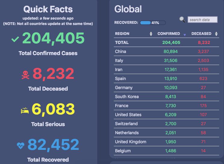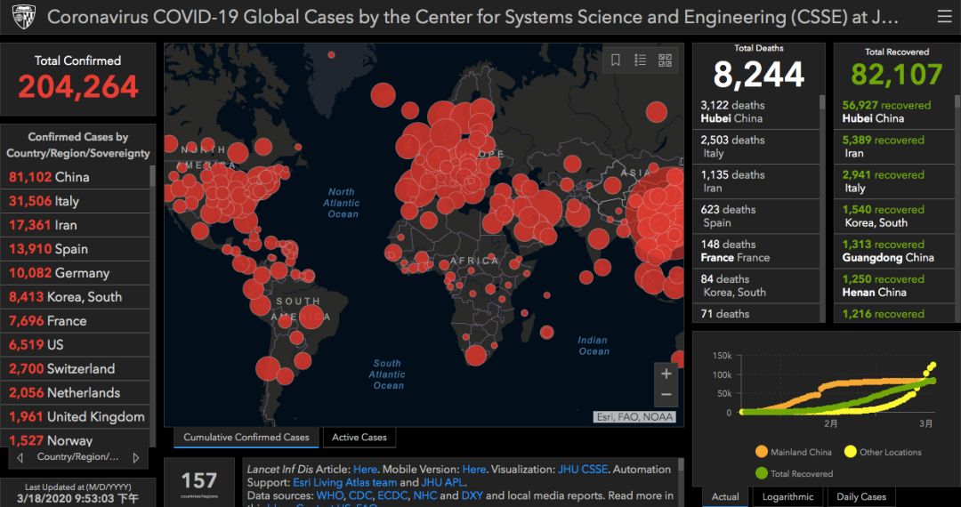 约翰·霍普金斯大学建立了一个令人印象深刻的dashboard,它包含了来源可靠的数据,并定期更新,让全世界看到了疾病的传播和死亡率。GitHub上提供了可以复制和修改的代码。