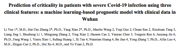 论文题目:使用以下三种临床特征预测重度Covid-19感染患者的危重程度:基于机器学习的武汉市临床数据预测模型