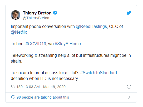 Netflix公司CEO 里德·哈斯廷斯(Reed Hastings)与欧盟内部市场和服务专员蒂埃里·布雷顿(Thierry Breton)通过电话进行了交谈,双方讨论了如何保持互联网的平稳运行,当前由于冠状病毒疫情的流行,迫使人们将更多的日常活动转移到了互联网上。