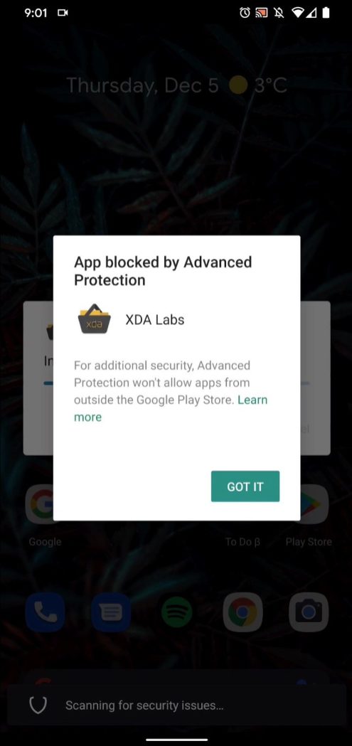 作为一项附加的保护措施,我们现在禁止将大多数非 Play 应用安装在已注册了 Advanced Protection 的 Google 帐户的任何设备上。