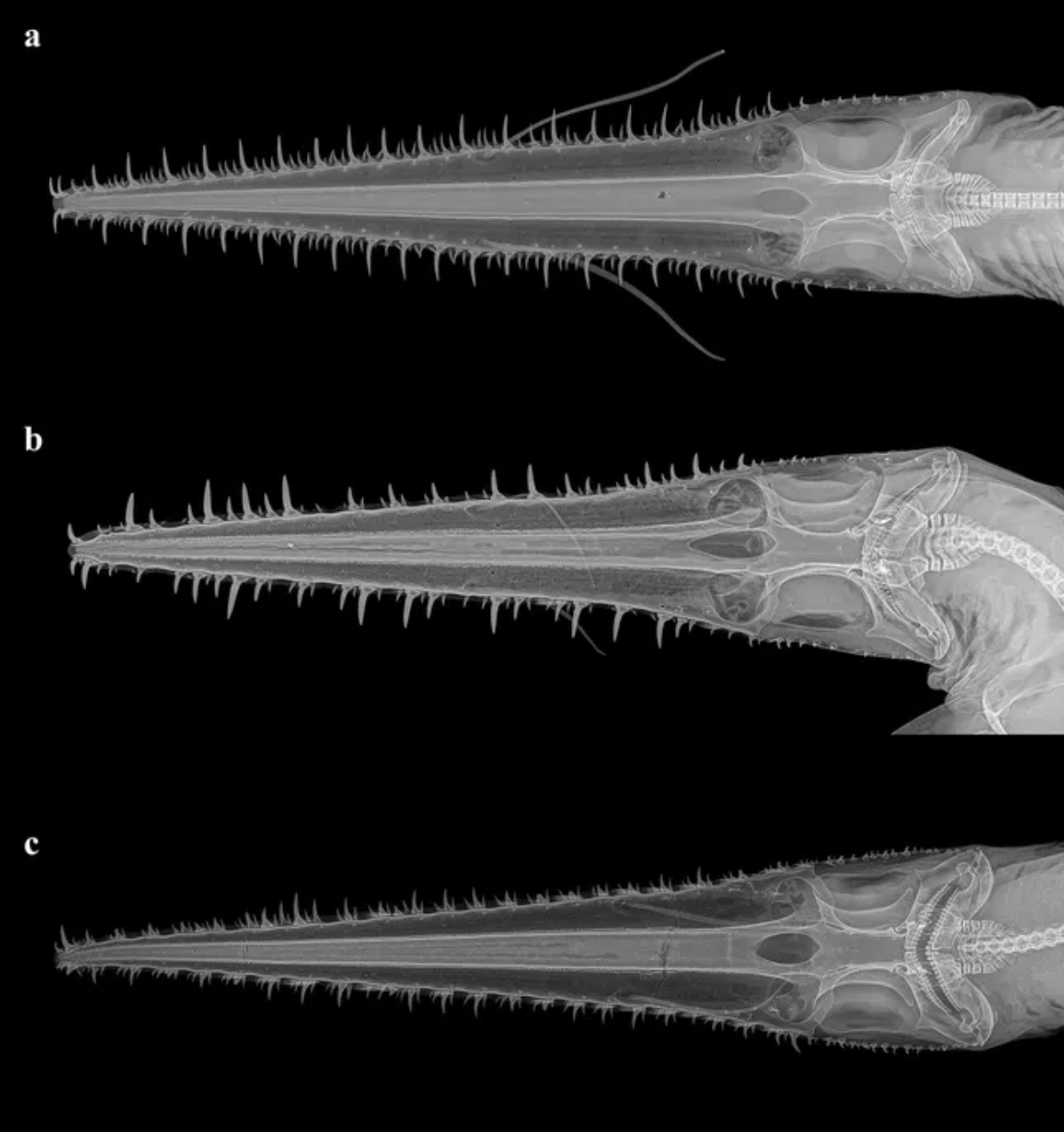 在这一发现之前,已知的六鳃锯鲨只有一种,即六鳃锯鲨(Pliotrema warreni)。这些鲨鱼的头部X光照片能够显示它们之间的区别。