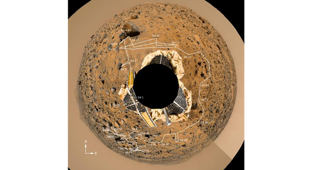 机遇号的史诗之旅还包括游览维多利亚撞击坑,并在巨大的努力撞击坑外围进行了一次短途旅行,最后,它被一场全球性的火星沙尘暴击倒,其太阳能电池板被挡住,无法接触到阳光。机遇号还路过火星上的几块陨石,包括一大块名为“防热护盾岩”(Heat Shield Rock)的金属,显示了火星如何遭受小行星的撞击。