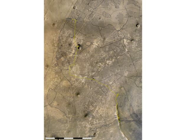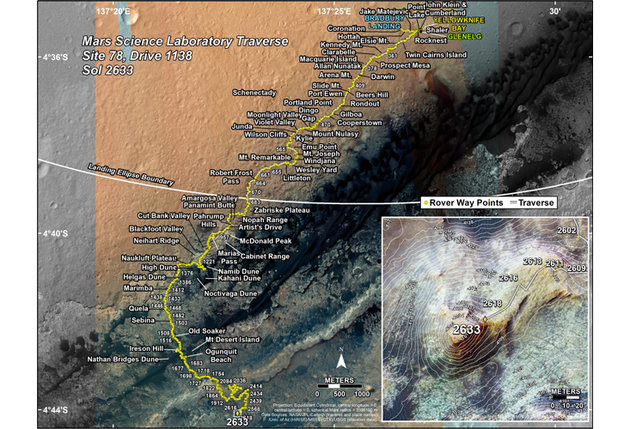 随着大量图像的涌入,“好奇号”已经走过了21.6公里。从地图上可以看到,任务科学家们已经有点疯狂,他们给每一块岩石都起了名字,给好奇号经过的每一个地方起了名字。好奇号在盖尔撞击坑的着陆点也是在早期任务收集的数据基础上确定的。盖尔撞击坑有35亿年的历史,直径150公里,后来充满了湿沉积物和尘埃,然后又遭到侵蚀。这种不同寻常的地质环境使好奇号得以在绕着撞击坑行驶的同时,研究火星历史上的不同时期。