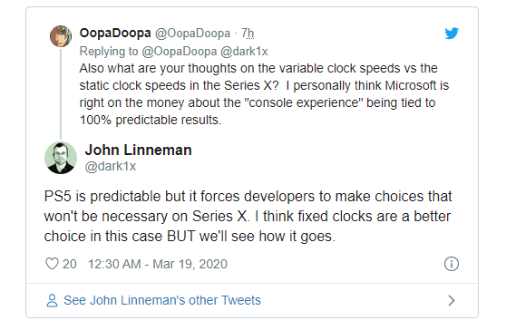 这可能会为游戏开发者带来一些问题。外媒DF记者John Linneman表示这种设计可能会强迫游戏开发者做出一些选择,而当为微软Xbox Series X开发游戏时就不会遇到这种问题,毕竟后者是固定频率。所以John认为目前来看,XSX的固定频率是一个更好的选择,但实际情况还需要未来的实战观察。