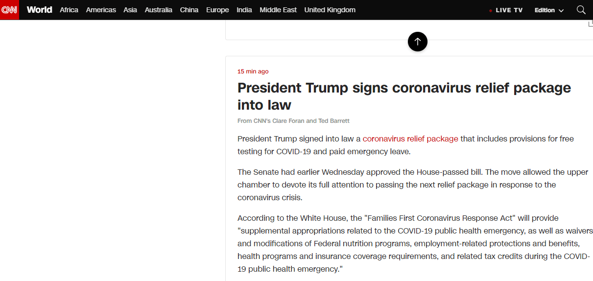 报道称,参议院周三(18日)早些时候批准了众议院通过的这项法案。CNN评论称,这一举措使参议院能够集中精力通过下一轮救援方案,以应对新冠肺炎疫情危机。