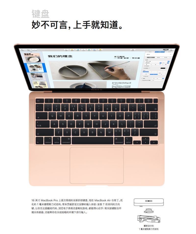 新款MacBook Air主要是从此前的蝶式键盘换成了全新的妙控键盘。在苹果官网上写道:“16 英寸 MacBook Pro 上首次亮相的全新妙控键盘,现在 MacBook Air 也有了。优化的 1 毫米键程剪刀式结构,带来灵敏舒适又安静的输入体验;呈倒 T 形排列的方向键,让你无论是翻阅代码、浏览电子表格还是畅玩游戏,都能得心应手;背光按键配合环境光传感器,还能帮你在光线较暗的环境下进行输入。”
