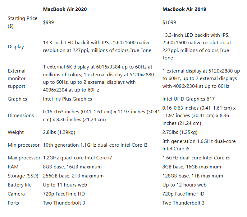 2020年的MacBook Air稍重,为2.8磅(1.29千克),而2019年款为2.75磅(1.25克)。除了重量上的增加之外,新款MacBook Air在电池容量上也有所缩水。苹果声称的电池续航时间现在可以长达11个小时,而之前有12个小时。