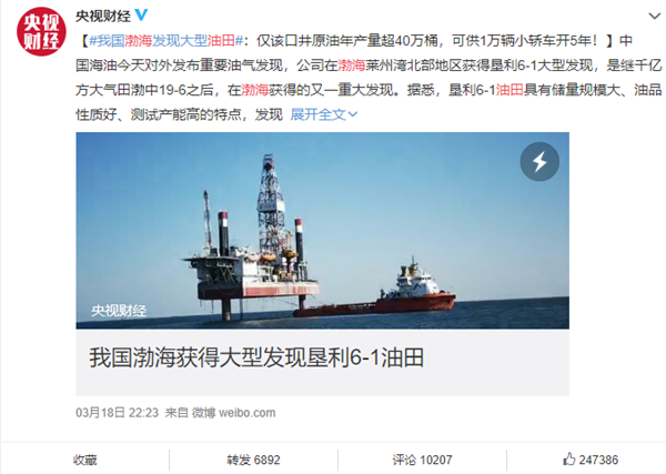 据@央视财经报道,中国海油3月18日对外发布重要油气发现,公司在渤海莱州湾北部地区获得垦利6-1大型发现,是继千亿方大气田渤中19-6之后,在渤海获得的又一重大发现。