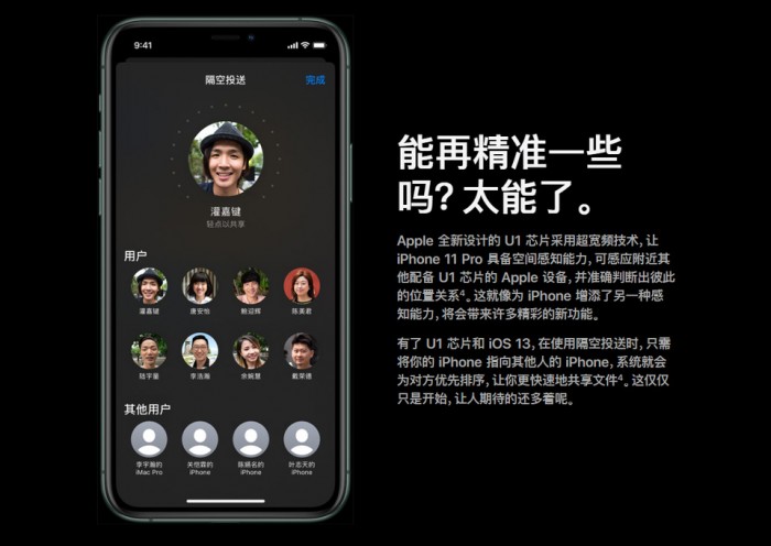 U1 超宽频芯片是苹果在去年 iPhone 11 系列中首次引入的新元件,在其加持下能够让设备具备空间感知能力,可感应附近其他配备 U1 芯片的 Apple 设备,并准确判断出彼此的位置关系,但目前能够实现的功能还较为单一,只能在使用 AirDrop 时实现“指向优先排序”的功能。但对于未来,这枚芯片将会随着 AR 布局实现更大的作用,甚至可能借助新的 CarKey API 将设备变为“车钥匙”。