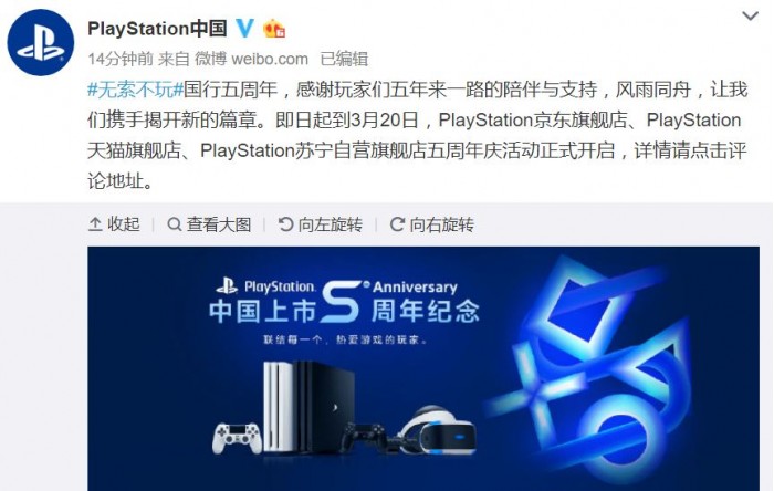 为庆祝PlayStation国行上市五周年,官方宣布于3月19日至20日举办五周年庆活动,PlayStation中国在几大商城的旗舰店都开启了限时优惠活动。