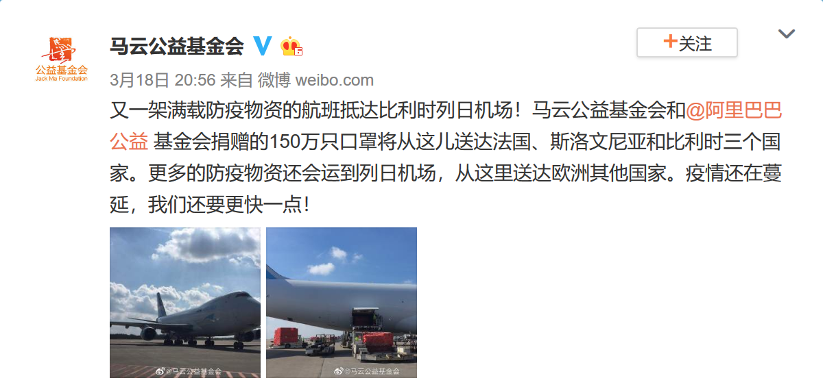 马云公益基金会发文表示:“又一架满载防疫物资的航班抵达比利时列日机场,其中包括了 150 万只口罩等物资,将送往法国、斯洛文尼亚和比利时三个国家。更多的防疫物资还会运到列日机场,从这里送达欧洲其他国家。疫情还在蔓延,我们还要更快一点!”