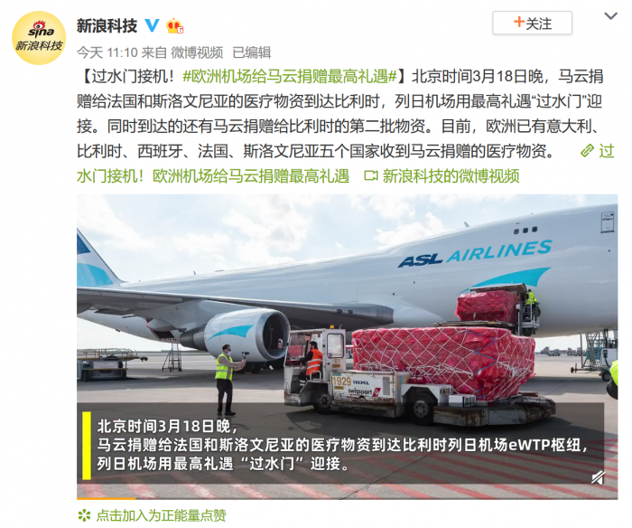 据国内媒体报道,3月18日晚间,马云捐赠给法国和斯洛文尼亚的医疗物资到达比利时列日机场eWTP枢纽。值得注意的是,列日机场用最高礼遇“过水门”迎接。与此同时,到达的还有马云捐赠给比利时的第二批物资。