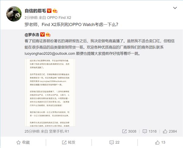 3月19日消息,锤子科技CEO罗永浩宣布做电商直播,本人同时向品牌厂商发出合作邀请。在公布这个消息之后,OPPO副总裁沈义人、联想集团官方微博均在微博表达了合作意向,其中OPPO有意合作的带货产品是Find X2系列和OPPO Watch智能手表。