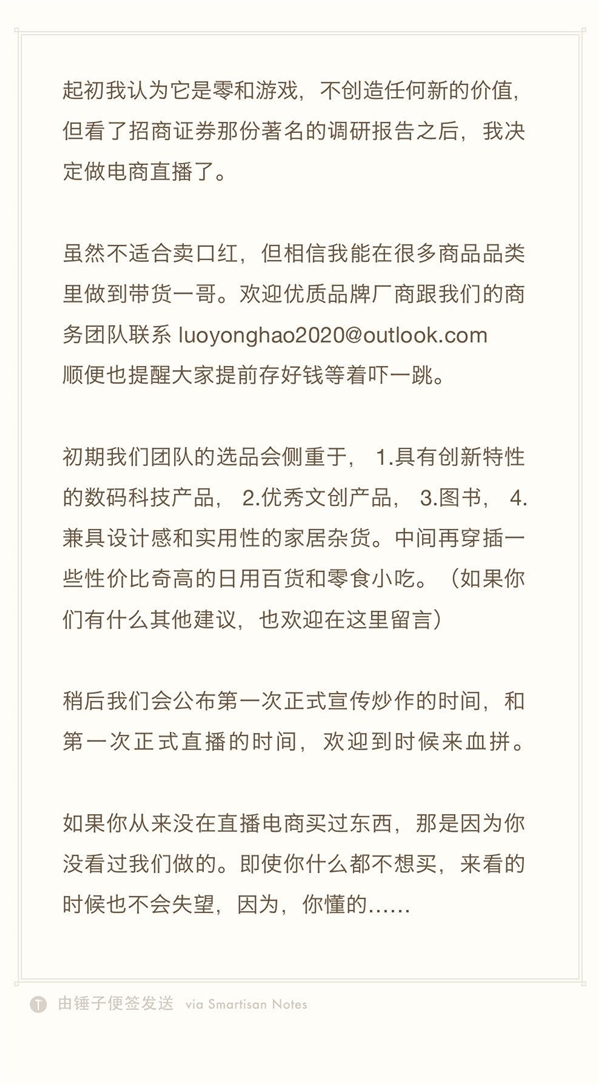 罗永浩表示,虽然本人不适合卖口红,但是相信能在很多商品品类里做到带货一哥。如果你从来没有在直播电商买过东西,那是因为你没看过我的。即使你什么都不想买,来看的时候也不会失望,因为你懂得。