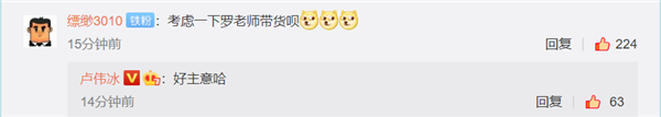 值得注意的是,有网友建议Redmi请罗永浩带货K30 Pro,小米集团副总裁、Redmi品牌总经理卢伟冰称赞这是一好主意。