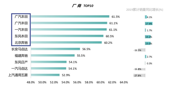 从排名来看,前十名之中,日系品牌占到了七成,包括了本田、丰田、日产和马自达等日系品牌。其中广汽本田以61.5%的成绩荣获冠军,广汽丰田则略微次之。