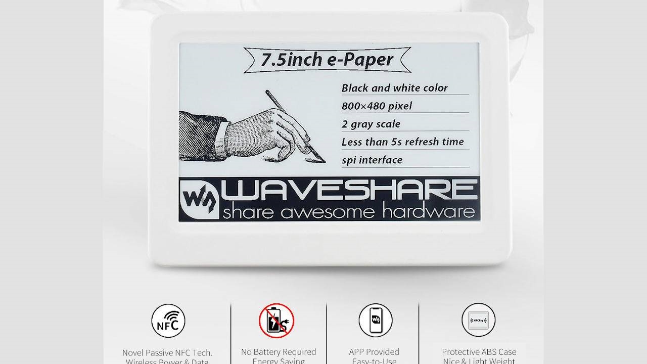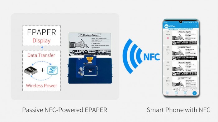 Waveshare的创新之处在于,他们利用NFC来为E-Ink电子纸的启动和刷新提供电力,甚至可以支撑一台7.5寸 800x400的墨水屏。