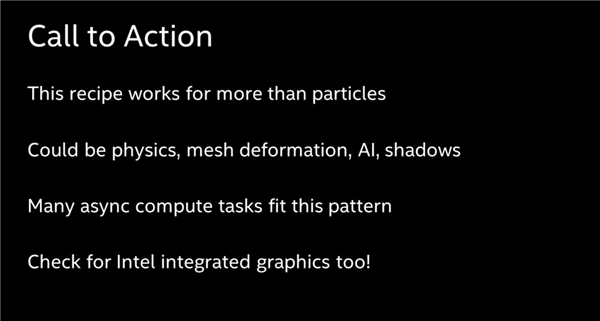 对Intel来说,独显+核显并行的工作不只是用来渲染3D,还可以做物理运算、AI、阴影、网格变形等,很多异步工作都可以完成。