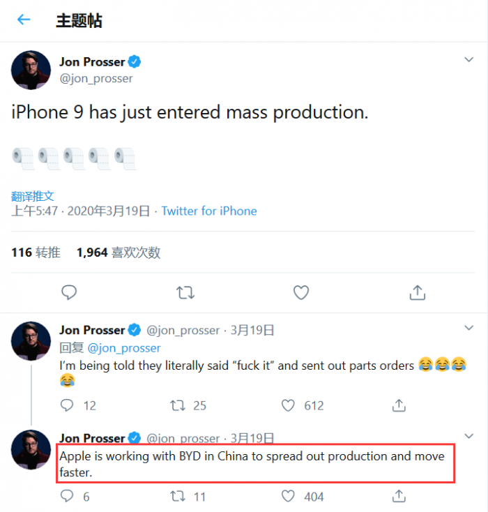 分析师乔恩·普罗瑟(Jon Prosser)表示,苹果已经开始量产iPhone 9。在后续推文中,他表示苹果公司正在和中国制造商比亚迪合作以加快生产进度。