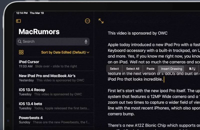 在文本编辑应用程序中,用两指点击手势会显示“剪切”,“复制”和“粘贴”选项,并且在大多数应用程序中都有右键单击手势来显示菜单栏。苹果表示在iPadOS 13.4中还将会让更多应用程序支持鼠标和触控板交互,开发者可以利用SDK在自家的应用中提供支持。