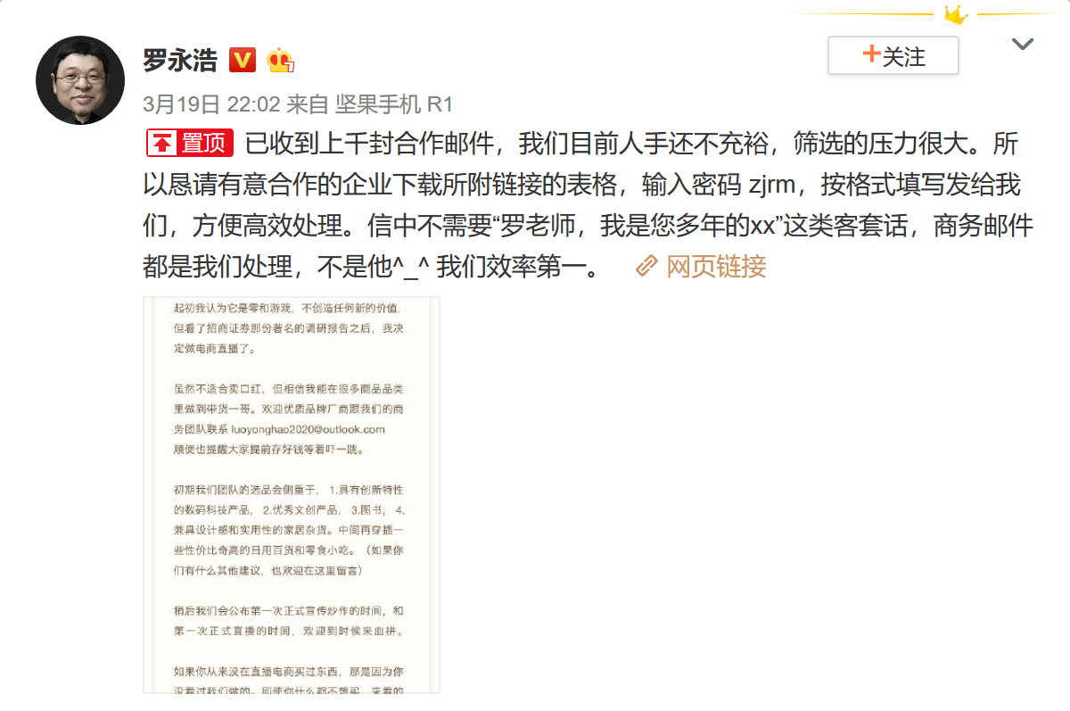 3月19日晚间,锤子科技CEO罗永浩在决定做电商直播之后,已收到上千封合作邮件。罗永浩表示,目前团队人手还不充裕,上千封合作邮件筛选的压力很大。所以恳请有意合作的企业下载表格,按格式填写发给我们,方便高效处理。