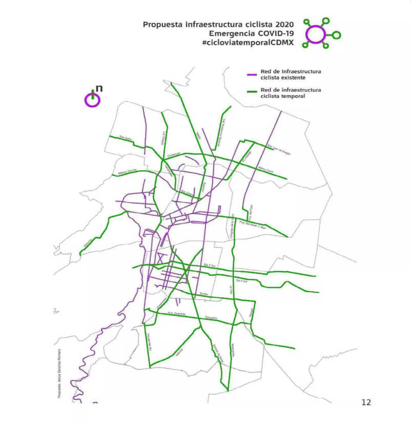 该图以绿线显示了为墨西哥城提议的新自行车道。紫色线表示现有的自行车道。这种想法来自哥伦比亚的波哥大,该市制定了临时自行车道以帮助实施“社会隔离”。对于美国的一些主要城市来说,这可能是使人们在COVID-19大流行中出行的流行解决方案。
