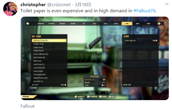 “甚至在《辐射76》里厕纸都价格昂贵供不应求”